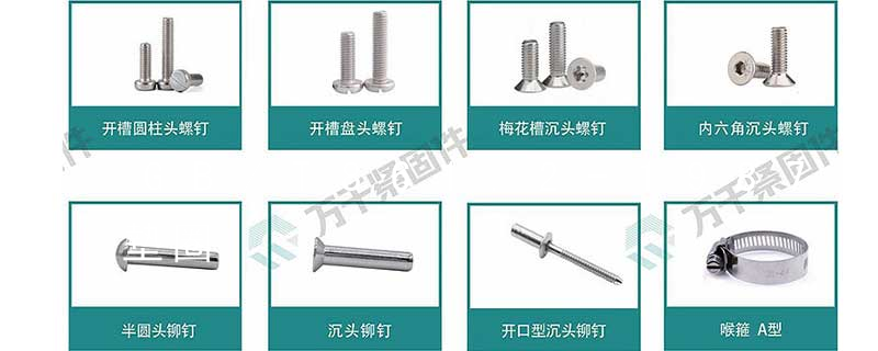 墊圈類:平墊、波形墊圈、鞍形墊圈、彈簧墊圈、開口擋圈、軸用擋圈、孔用擋圈、內外齒鎖緊墊圈、內外鋸齒鎖緊墊圈、方墊圈等 精密類:盤頭自攻釘、沉頭自攻釘、大扁頭自攻釘、盤頭機螺絲、沉頭機螺絲、大扁頭機螺絲、鉆
