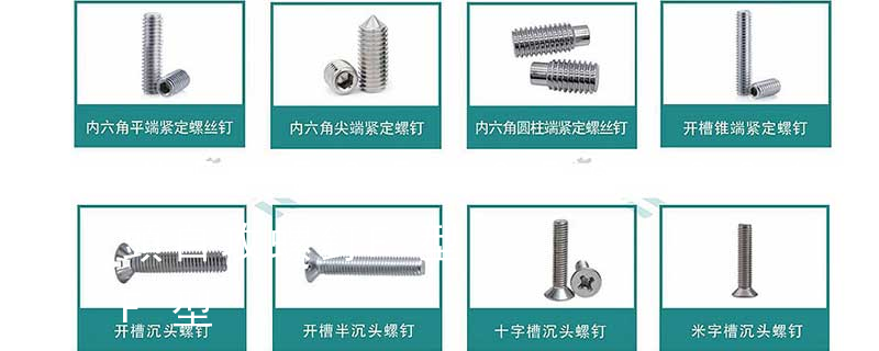 沉頭內六角螺釘(平杯)、半圓頭內六角螺釘(圓杯)、十字槽盤頭機螺釘、十字槽沉頭機螺釘、十字槽大扁頭機螺釘、十字槽盤頭自攻釘、十字槽沉頭自攻釘、十字槽大扁頭自攻釘、全牙絲桿(牙條)、六角螺母、法蘭